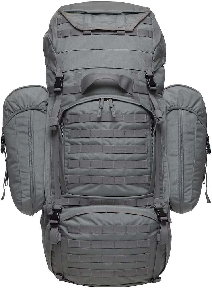 Ekstra stort hovedrom som kan deles inn i to separate rom. Tre innganger: toppåpning med snølås, to frontåpninger med doble glidelåser – en i øverste rom og en i nederste rom. Tre kompresjonsremmer i sidene. Sekken kan kobles fra pakkrammen i aluminium, slik at du kan feste oppakningen direkte til rammen og bæresystemet, som deretter kan brukes separat til å frakte andre ting, som kasser, jaktbytte osv. Molle-systemet rundt sekken gir mange muligheter for å stroppe fast det du måtte ønske til ryggsekken.