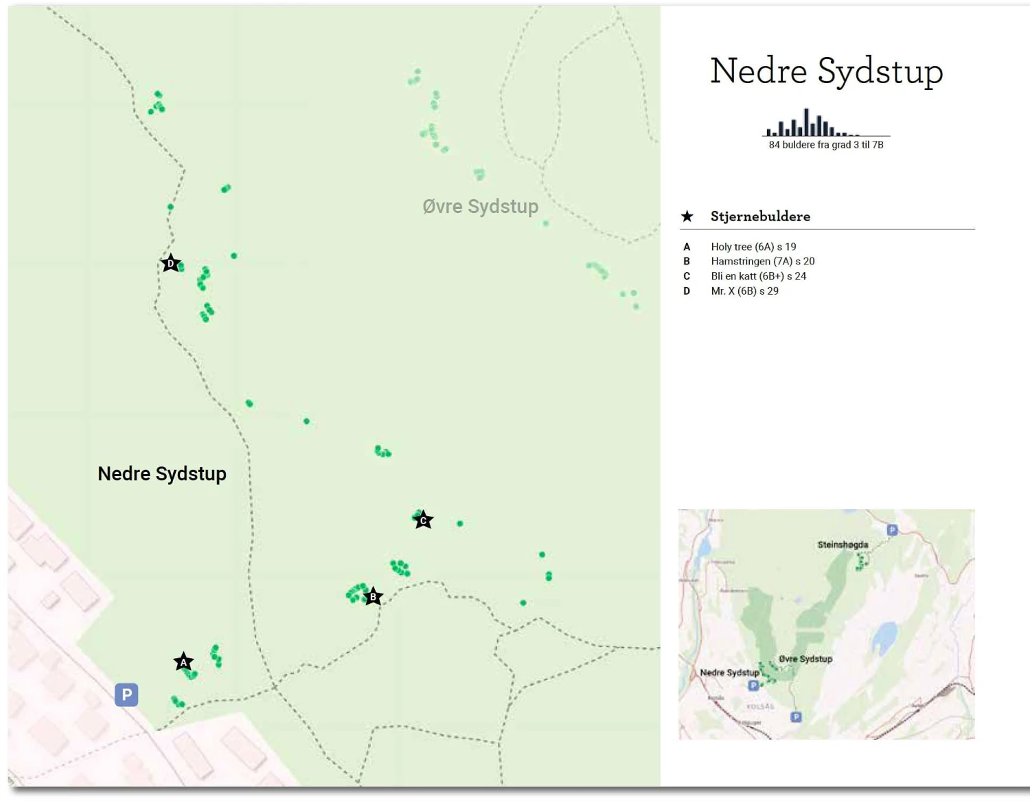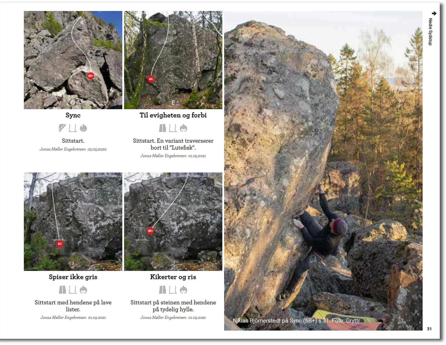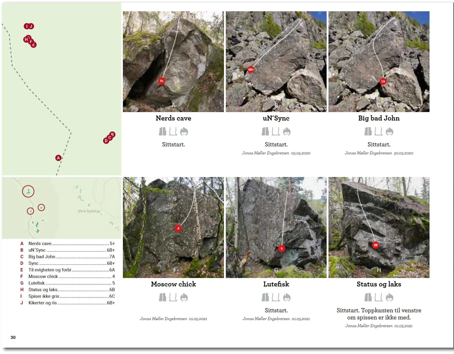 I og rundt Østmarka i randsonen av byen fra Hellerud til Skullerud har mest buldring med over 1500 problemer, hvorav 500 har kommet til de siste årene. De andre områdene har rundt 500, så i føreren er det 2000 buldere på 384 tettpakkede sider. Vertikalt anbefalt av Sportsnett!