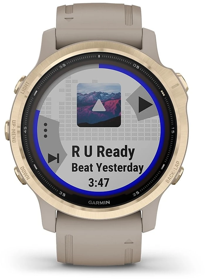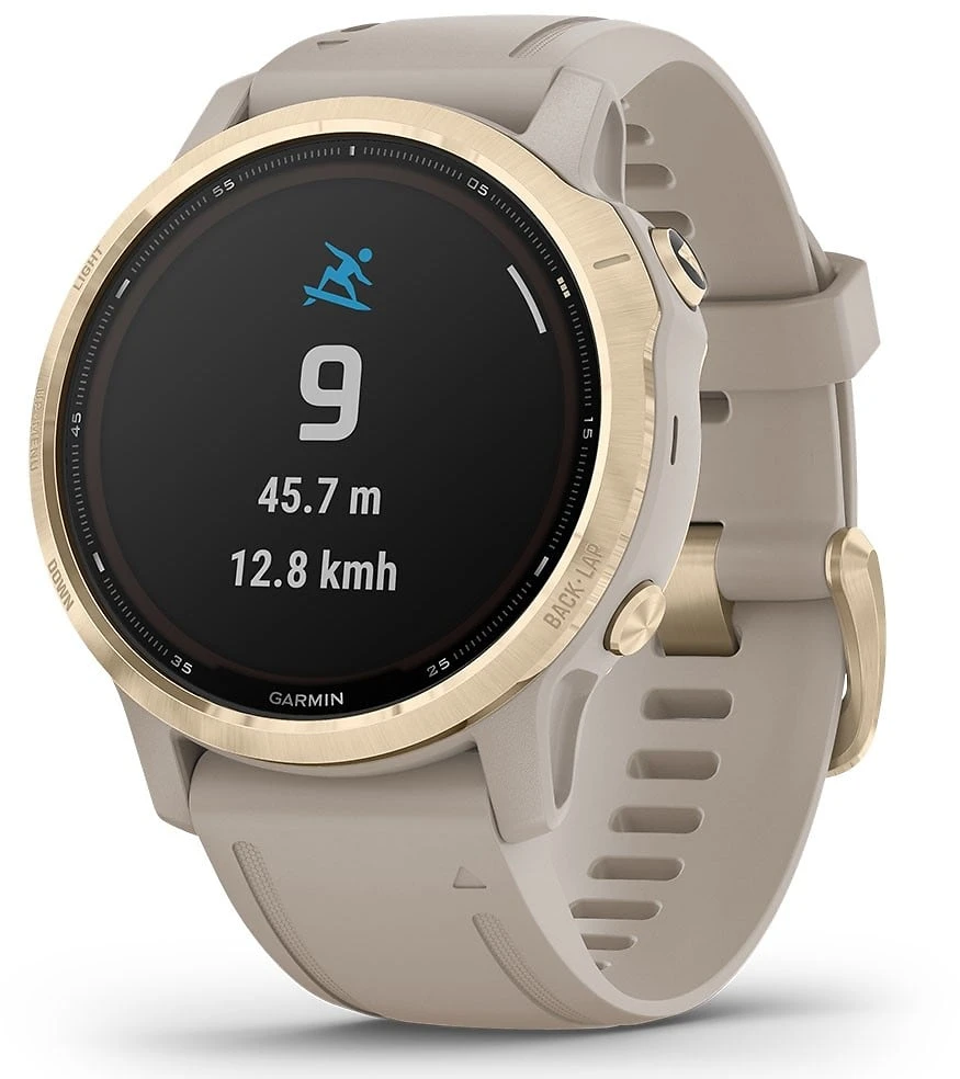 Garmin fenix 6S Pro Solar i gull med sandfarget reim. En multisportsklokke med sollading med pent design blir din kompis gjennom hele dagen! Med en 1,2 tommer skjerm har du god oversikt over all informasjon. Dette er en klokke du virkelig kan stole på.