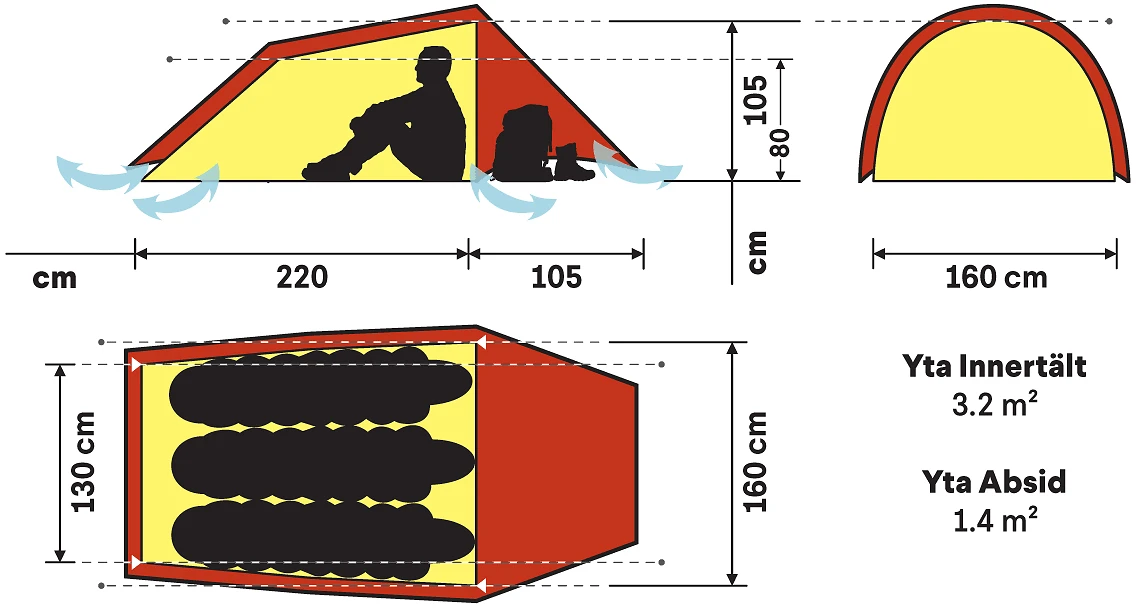 - Ytterteltet går ikke hele veien til bakken, for økt luftgjennomstrømning, men med full beskyttelse mot regn
