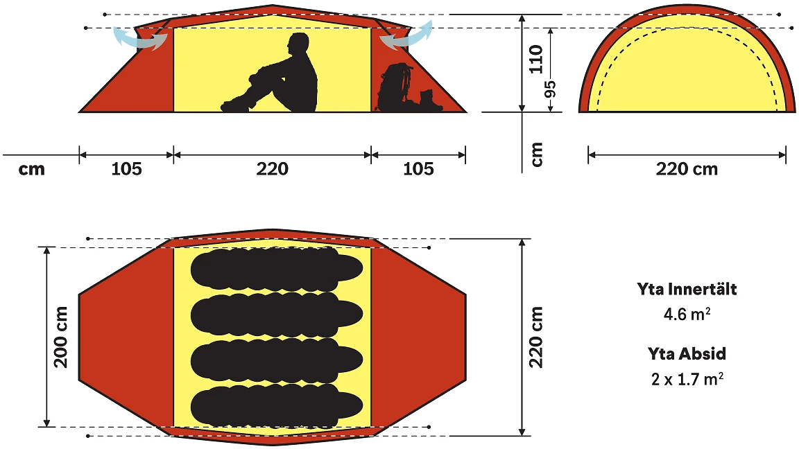 - Ventilasjonsluker i hver ende av teltet, kan lukkes og åpnes både ute og innenfra