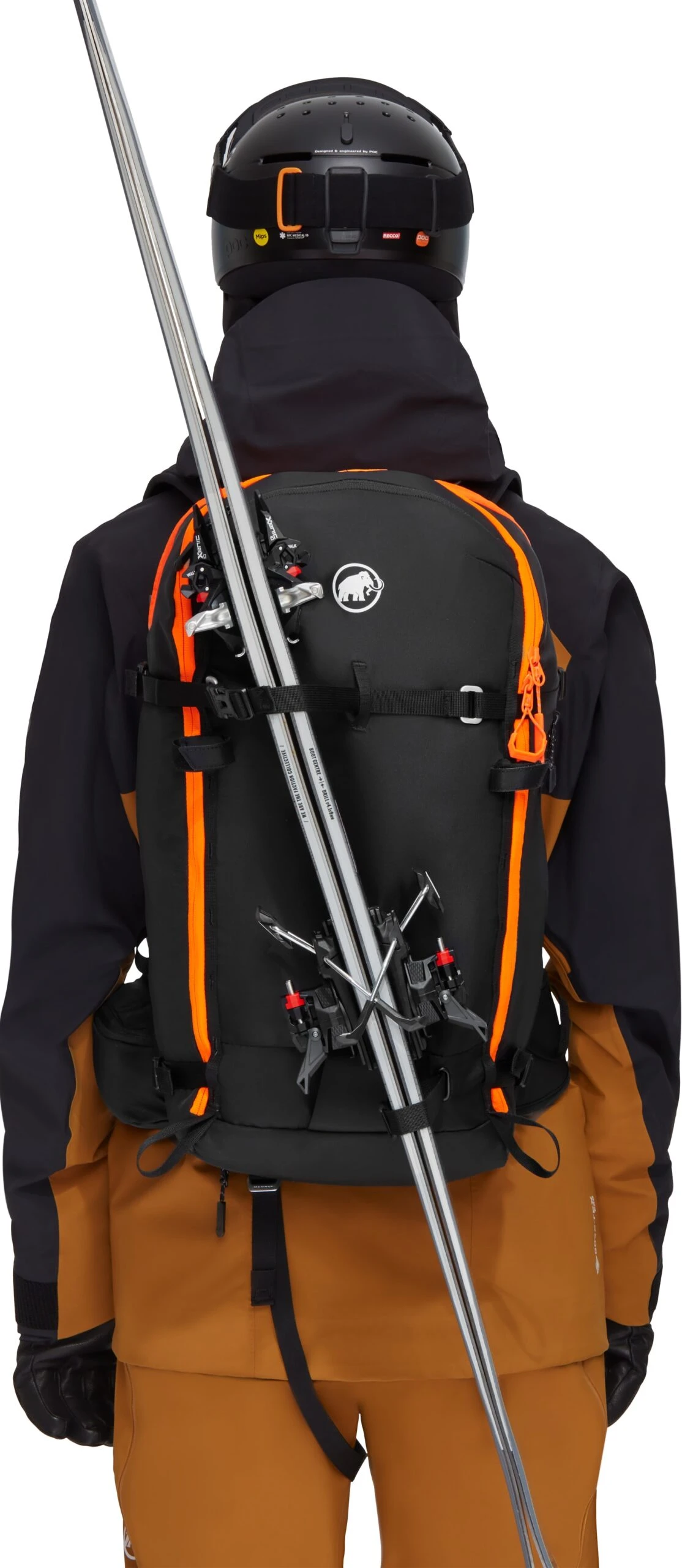 Komfortabel, mellomstor skredsekk med Mammuts uttakbare Removable Airbag System 3.0 som utløses med gasspatron. Sekken er lett og har alt du forventer av en skredryggsekk. Removable Airbag System 3.0 er pålitelig, solid og av de letteste på markedet, og kan brukes i andre skredsekker i Mammut-serien om du har behov for mer plass i sekken eller ønsker en mindre sekk. Stor hesteskoformet glidelås gir deg enkelt tilgang til sekkerommet. Oppbevar sikkerhetsutstyret i det separate oransje rommet med høy synlighet. For å toppe det hele har sekken nyttige funksjoner som hjelmholder, sidekompresjonsstropper og løkker for staver og isøks.