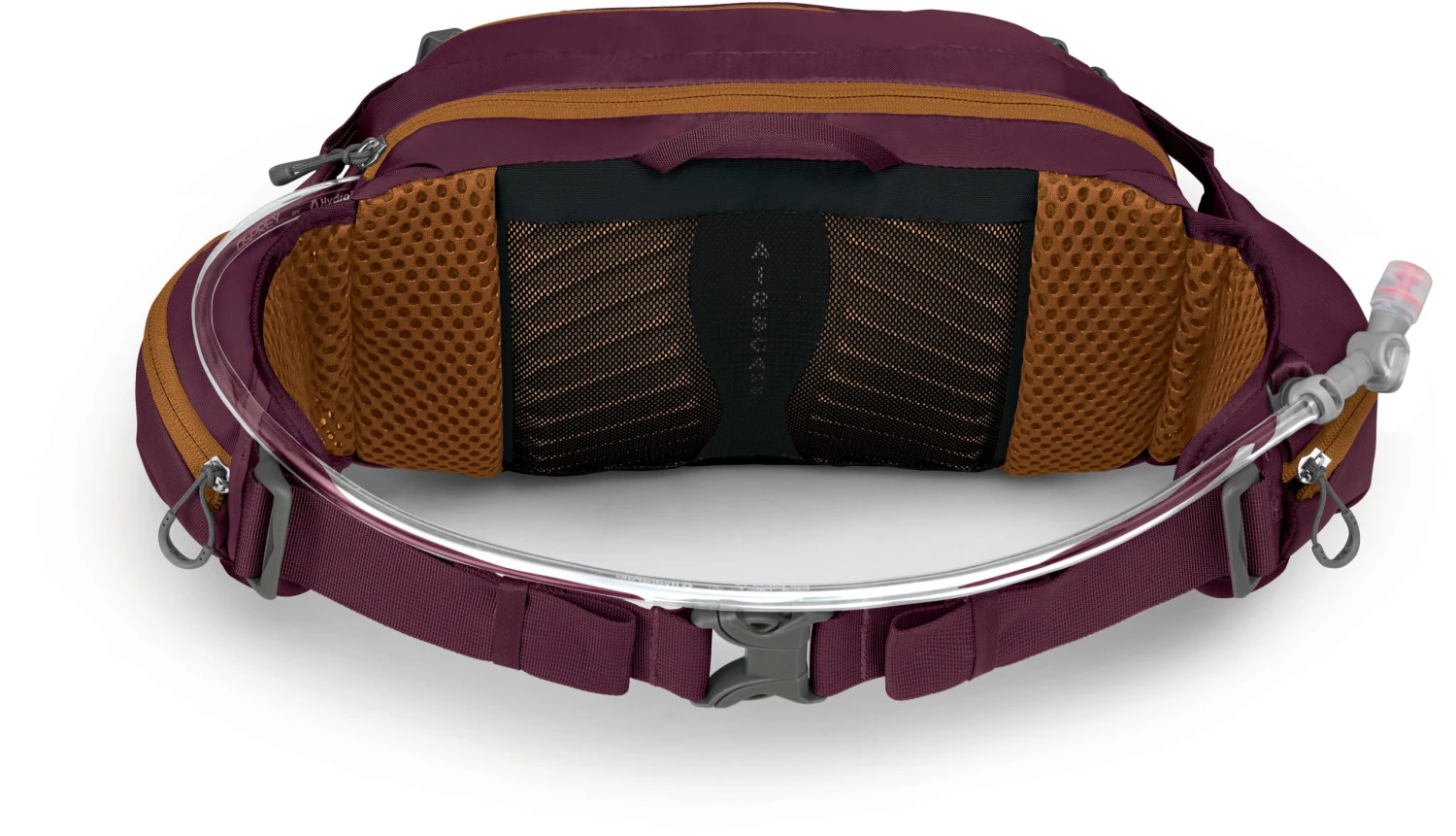 Et sykkeltilpasset, vinklet hoftebelte og kompresjonsstropper gir deg stabilitet og komfort ved at sekken holdes tett inntil kroppen. Dette oppnås ved at hoftebeltet i pustende luftnetting former seg etter hoftekammen. Ospreys tversgående ErgoPull-system med stroppelukking holder sekken inntil korsryggen, og sidekompresjonsstropper holder vekten tett mot kroppen og gir en behagelig, sikker og stabil bæremåte.
