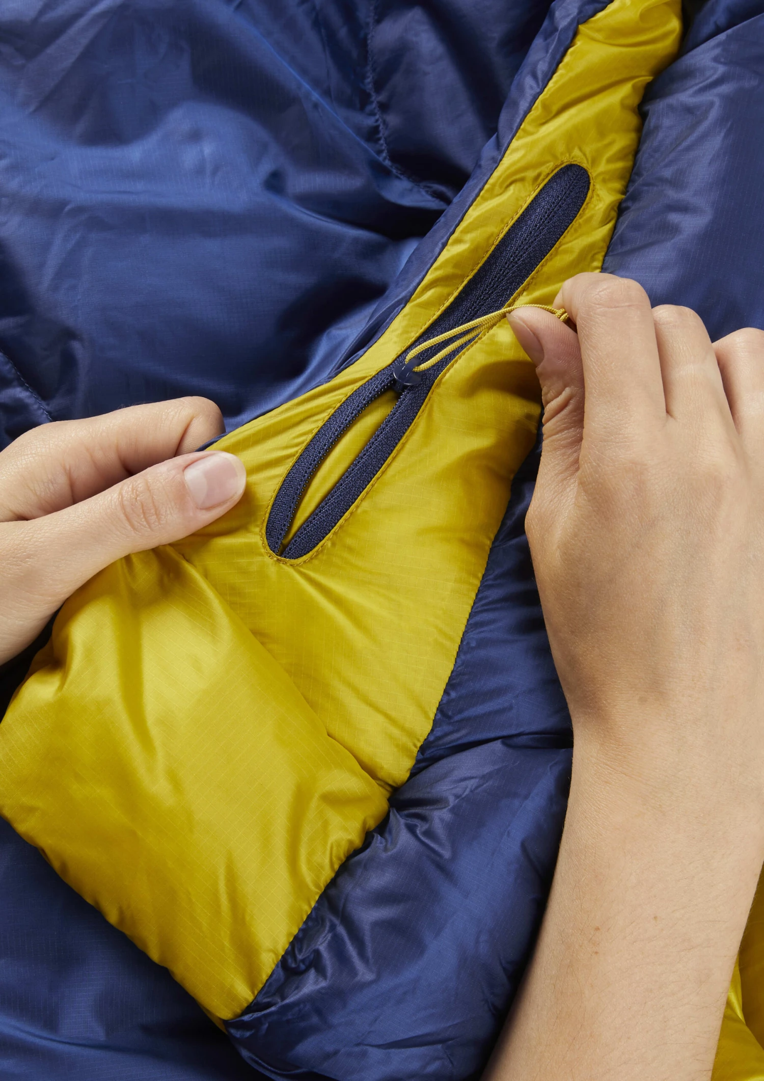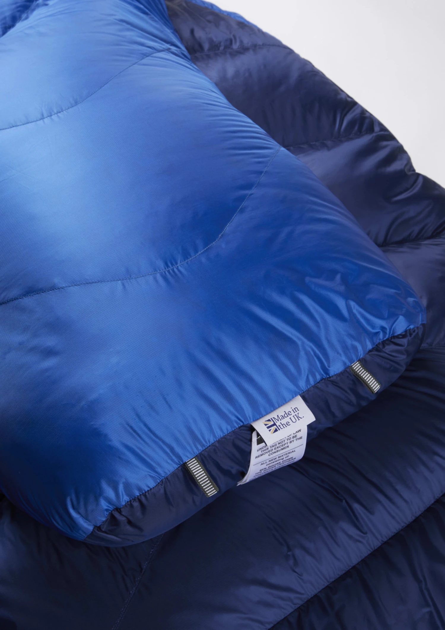 Trapesformede dunkanaler hindrer at dunen flytter på seg når du beveger på deg i soveposen, samtidig som det muliggjør at det tykkeste laget med dun blir liggende over kjernen av kroppen. Pertex Qantum materiale gjør at den pakker svært lite, samtidig som det lette ytterstoffet gjør at dunen kan ekspandere mest mulig.