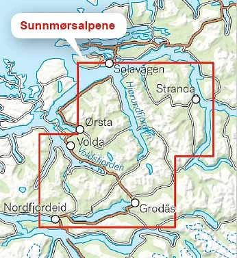 I Sunnmørsalpene stuper hvitkledde fjellsider ned mot dype fjorder, og fra toppene kan du se panoramaet av alpine tinder og isbreer. Her finner du krevende klassikere som Slogen (1564 moh), Randers Topp (1414 moh) og Kolåstinden (1432 moh), men også enklere turer som Levandehornet (917 moh), Melshornet (807 moh), Sandhornet (909 moh) og Blæja (1420 moh). Kartet er beregnet for bruk året rundt og har også ruter for fotturer.